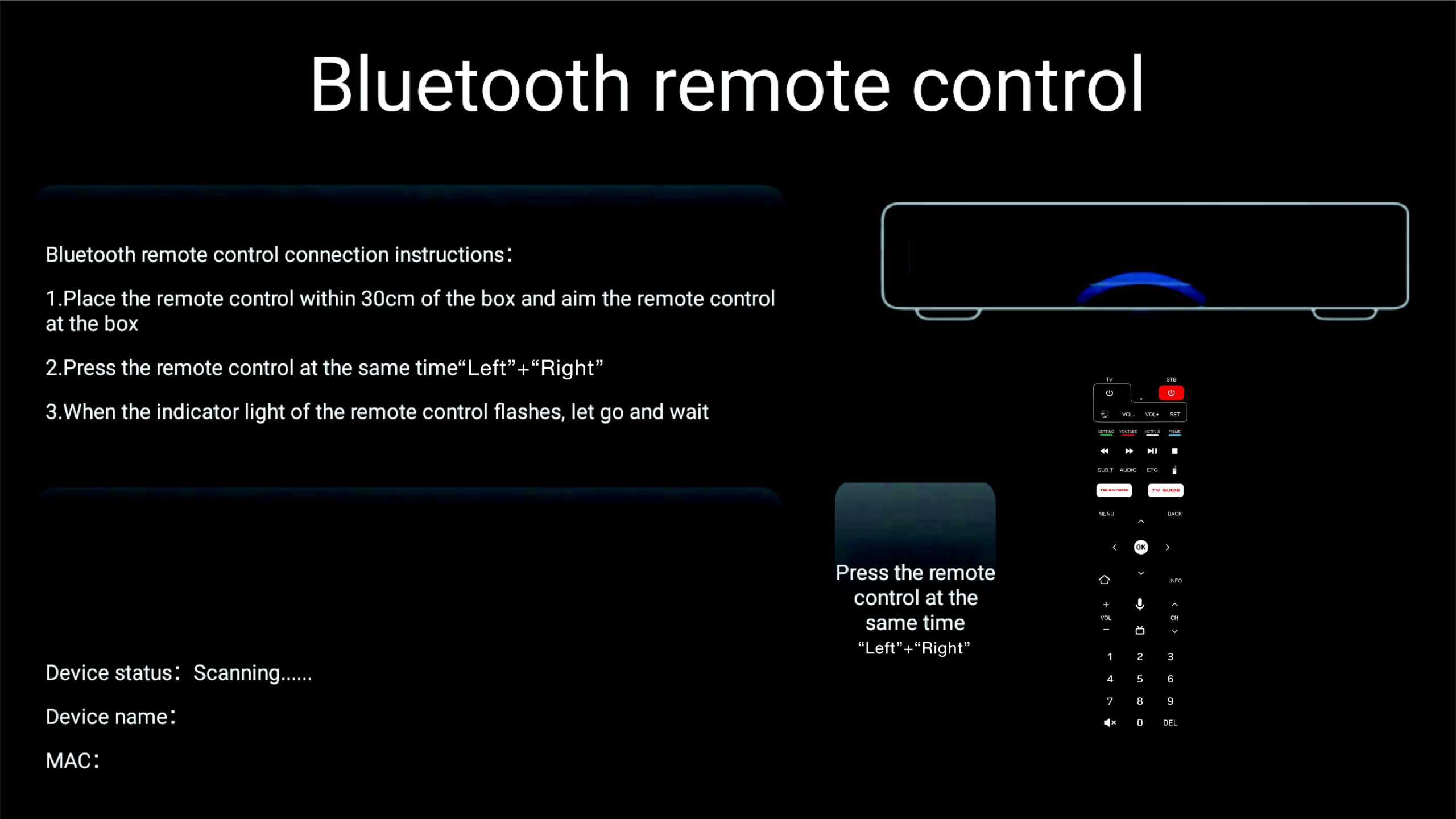 - Long press “Left” + “Right” button at the same time for more than 3 seconds. The remoteControl LED light blinks enter to auto pair mode.